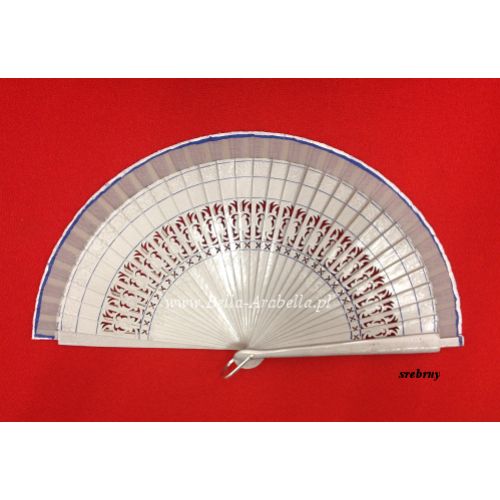 Drewniany stelaż z ozdobnymi wycięciami i dwustronną aplikacją z delikatnym białym, granatowym (lub odcieniami niebieskiego) akcentem, złączony jest "srebrnym" wygiętym (gładkim) złączem - umożliwiającym trzymanie wachlarza jednym palcem (właśnie za tę metalową rączkę) lub dorobienie do niego bransoletki na rękę.
