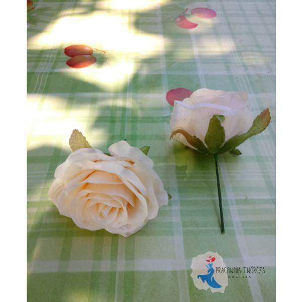 Każda RÓŻA ma przyklejone do płatków (od spodniej części płatków) jasno zielone listki (z miękkiej tkaniny).